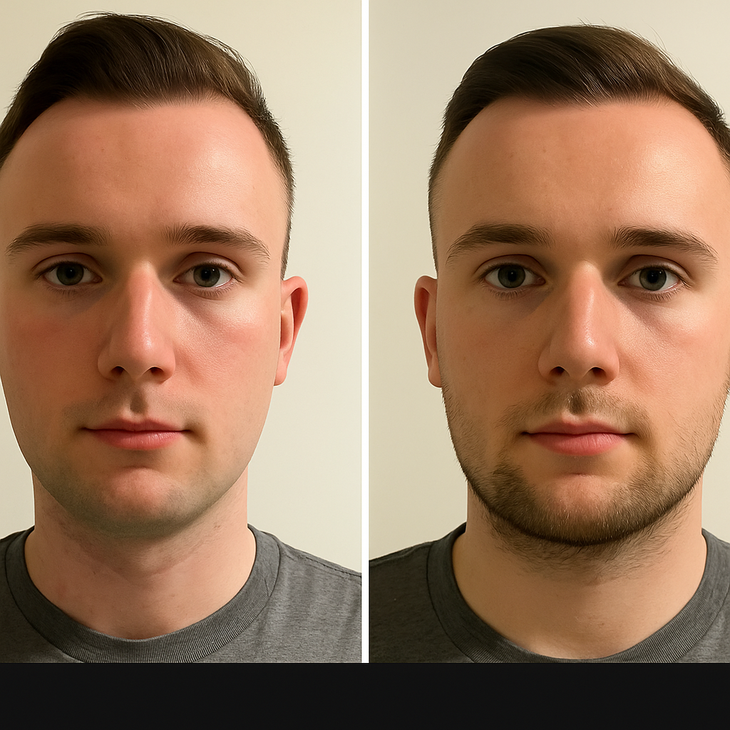 The transformation is really noticeable and impressive! In the before photo, the clean-shaven look gives a softer appearance, while in the after photo, the light beard adds more definition and maturity to the face. The overall skin tone looks healthier and smoother, with a natural glow. The subtle change makes a big difference in enhancing confidence and style. It’s a simple yet impactful improvement that looks effortless. I’m really happy with how refreshed and sharp the results appear.
